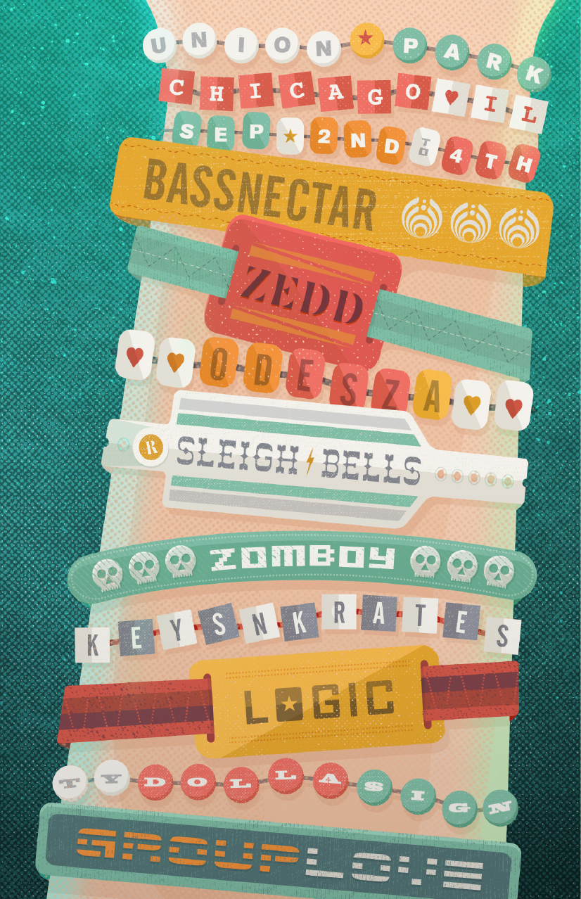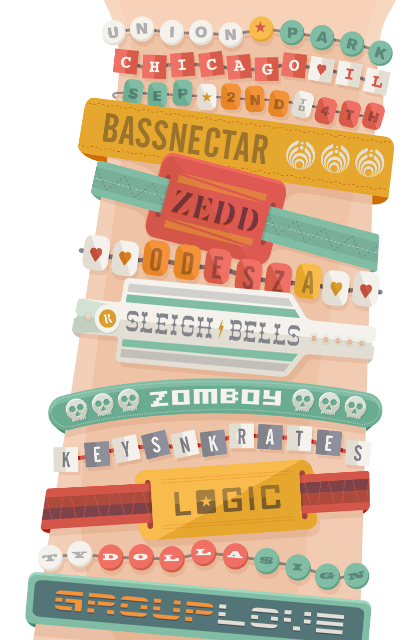 The North Coast Music Festival was first introduced in 2010 at Chicago’s Union Park. Since then, the festival has held an annual poster competition for fans. This poster submission encompasses the transcendence of peace, love and unity that electronic music fans enjoy each summer at their favorite shows. A number of headlining artists are featured on a variety of festival wristbands.